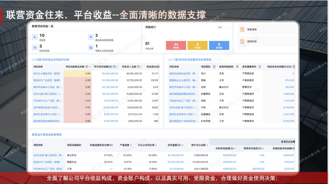 當(dāng)前公司數(shù)字化程度較低,通過(guò)簡(jiǎn)單的oa軟件、Excel表格、微信群、例會(huì)等傳統(tǒng)的管理方式進(jìn)行管理。近幾年隨著公司省外業(yè)務(wù)的拓展,項(xiàng)目越來(lái)越大,傳統(tǒng)的低效管理模式已經(jīng)無(wú)法滿足日常的管理需求。公司聯(lián)營(yíng)項(xiàng)目較多,個(gè)別項(xiàng)目出現(xiàn)資金挪用,虛開套現(xiàn),造成不必要的法律訴訟官司,甚至資金賬戶被凍結(jié)。此外,公司自營(yíng)項(xiàng)目,人材機(jī)等各項(xiàng)成本,當(dāng)前人工進(jìn)行把控,項(xiàng)目利潤(rùn)不達(dá)預(yù)期;人工進(jìn)行統(tǒng)計(jì),需要扒賬,實(shí)效性差,財(cái)務(wù)報(bào)表不能實(shí)時(shí)動(dòng)態(tài)呈現(xiàn)。