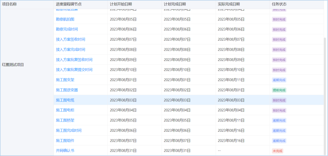 (2)施工節(jié)點(diǎn)管理:自持電站首先要保證項目進(jìn)度按期完成并網(wǎng),同時項目資料要完整保證合規(guī)性。通過紅圈系統(tǒng)能保障負(fù)責(zé)人及時了解到簽約項目的安裝進(jìn)度到了哪個節(jié)點(diǎn)、是否已經(jīng)并網(wǎng)等關(guān)鍵信息,真正做到對項目關(guān)鍵節(jié)點(diǎn)數(shù)據(jù)的把控,讓進(jìn)度更合理,讓收益最大化。