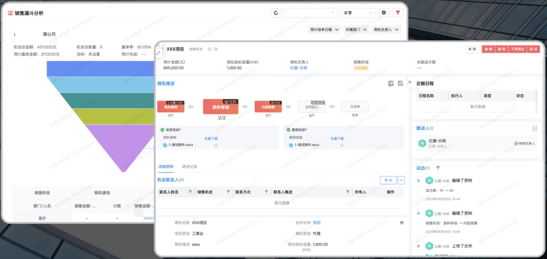 (1)開發(fā)管理:紅圈通過對客戶錄入-項目跟進(jìn)-流程管理,讓管理層能夠?qū)崟r了解目前公司在跟進(jìn)的項目數(shù)量是否可以支撐目標(biāo)達(dá)成,也便于通過系統(tǒng)對客戶跟進(jìn)流程進(jìn)行把控和及時指導(dǎo),輔助公司完成開發(fā)目標(biāo)。
