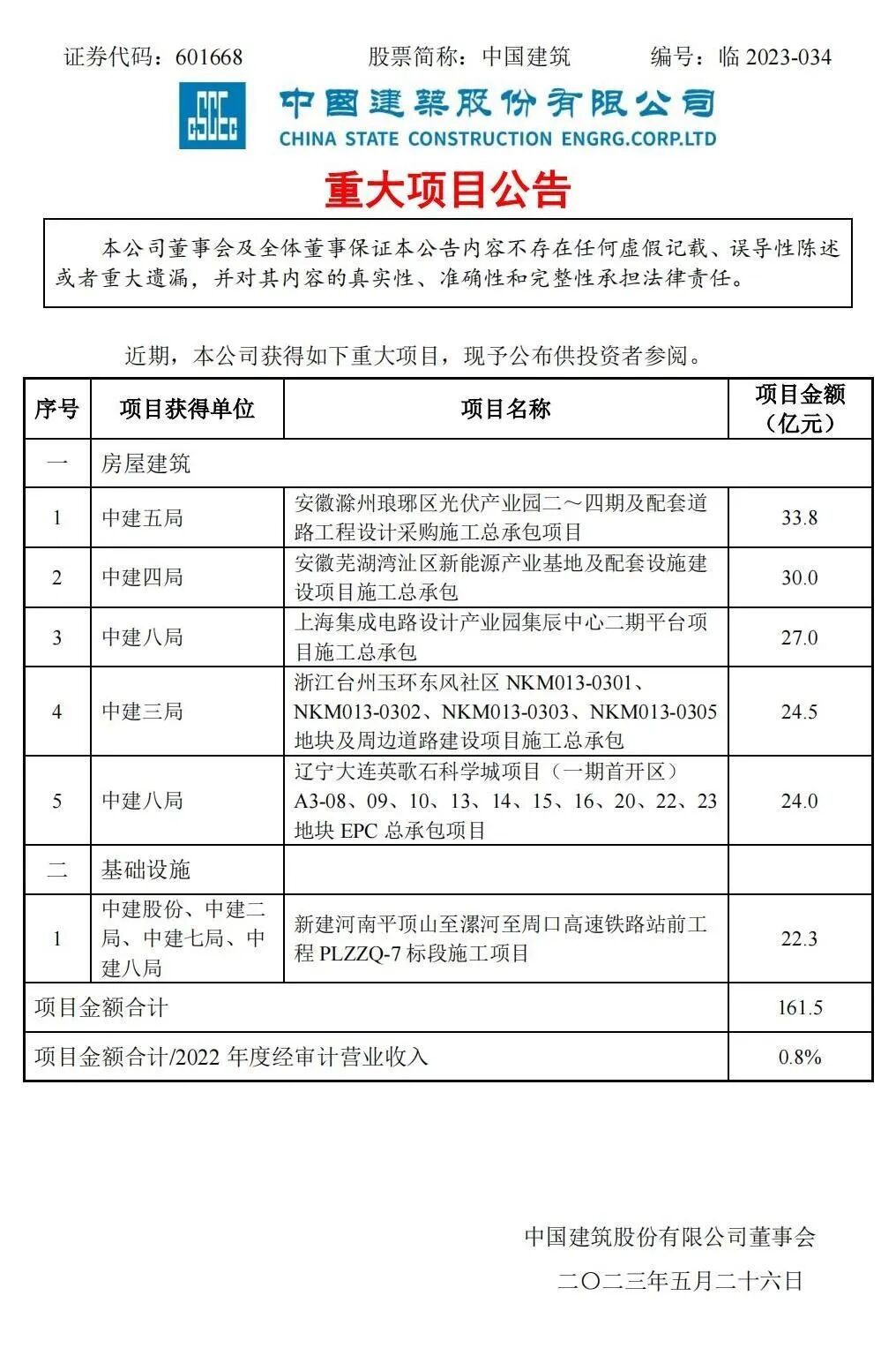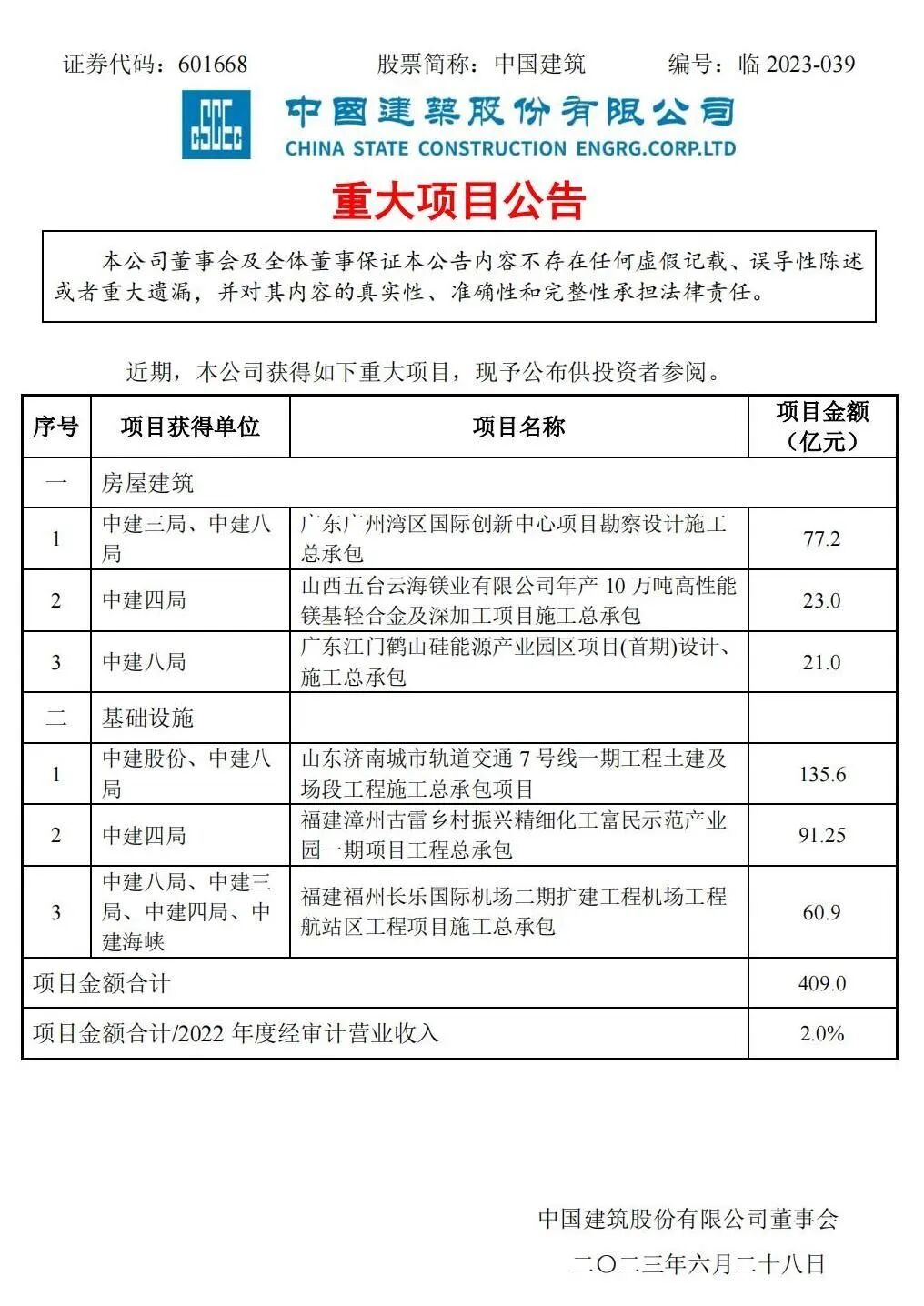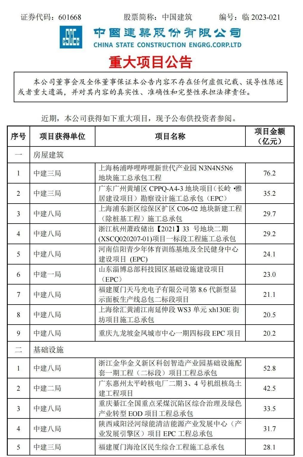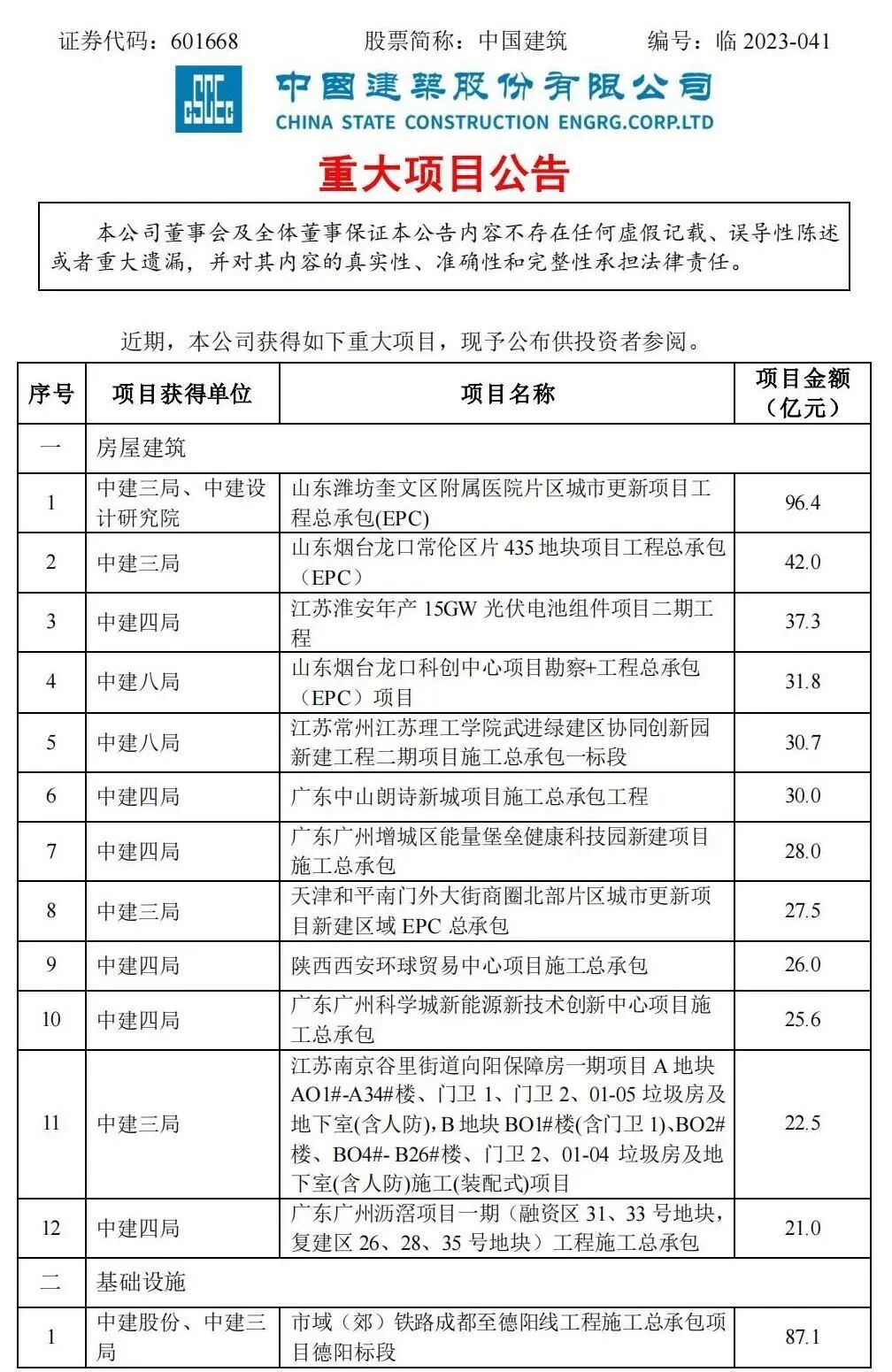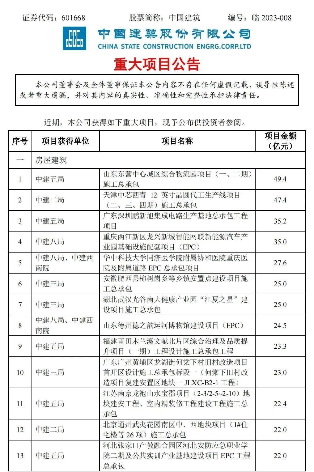 中國建筑20家子公司凈利潤出爐!附2023中標重大項目名單!