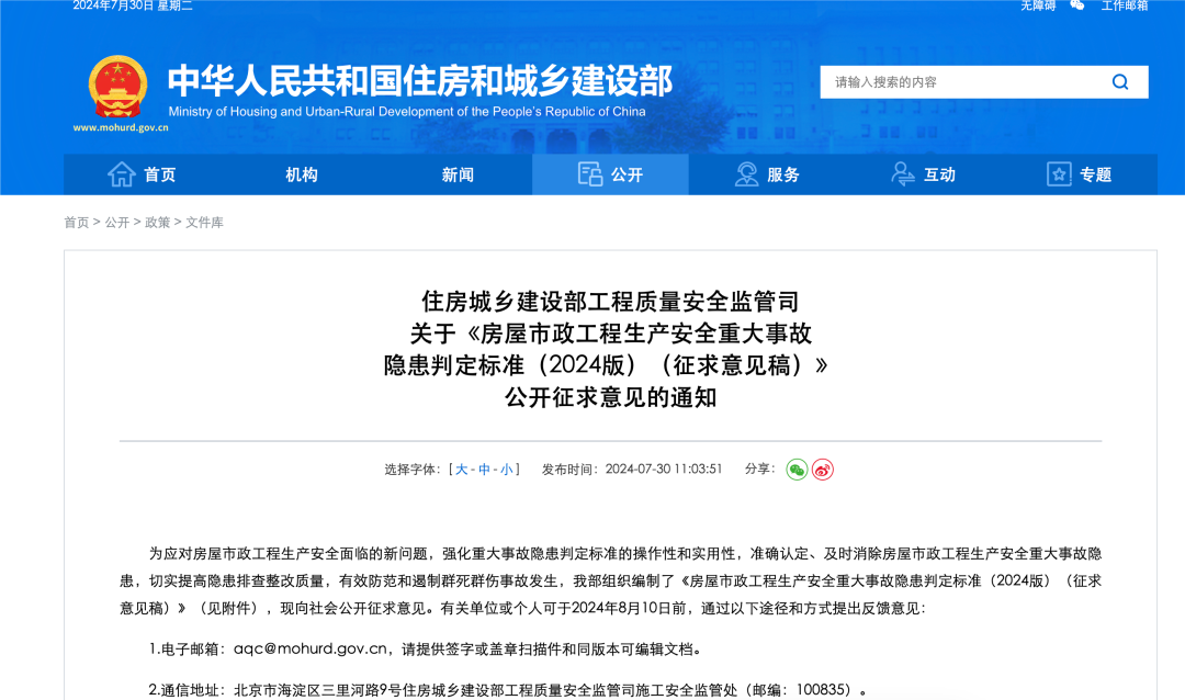 為應(yīng)對(duì)房屋市政工程生產(chǎn)安全面臨的新問(wèn)題,強(qiáng)化重大事故隱患判定標(biāo)準(zhǔn)的操作性和實(shí)用性,準(zhǔn)確認(rèn)定、及時(shí)消除房屋市政工程生產(chǎn)安全重大事故隱患,切實(shí)提高隱患排查整改質(zhì)量,有效防范和遏制群死群傷事故發(fā)生,我部組織編制了《房屋市政工程生產(chǎn)安全重大事故隱患判定標(biāo)準(zhǔn)(2024版)(征求意見稿)》(見附件),現(xiàn)向社會(huì)公開征求意見。有關(guān)單位或個(gè)人可于2024年8月10日前,通過(guò)以下途徑和方式提出反饋意見: