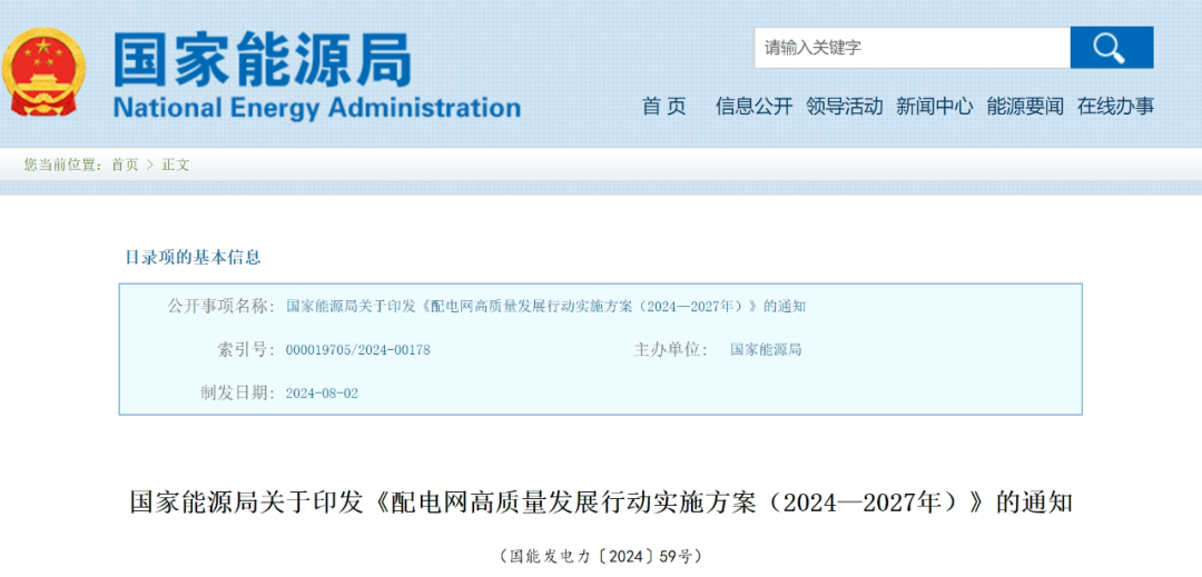 8月13日,國家能源局關于印發《配電網高質量發展行動實施方案(2024—2027年)》的通知。通知指出: