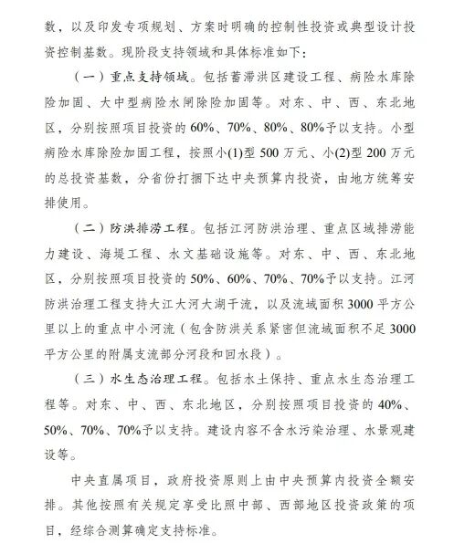 防洪排澇工程。包括江河防洪治理、重點區域排澇能力建設、海堤工程、水文基礎設施等。對東、中、西、東北地區,分別按照項目投資的50%、60%、70%、70%予以支持。江河防洪治理工程支持大江大河大湖干流,以及流域面積3000平方公里以上的重點中小河流(包含防洪關系緊密但流域面積不足3000平方公里的附屬支流部分河段和回水段)。